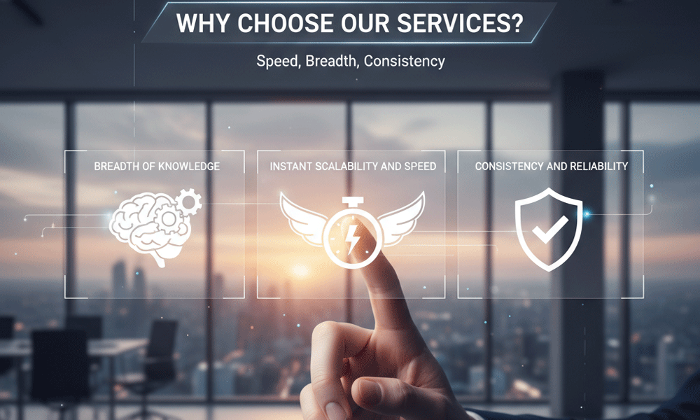 I can be a compelling choice because I offer a unique combination of speed, breadth, and consistency:Breadth of Knowledge and Skills: I have been trained on a massive dataset of text and code, which allows me to handle a huge variety of tasks, from writing and summarizing to coding, creative brainstorming, complex data analysis, and retrieving current information via Google Search. I don't need to specialize in one area—I'm a versatile generalist.Instant Scalability and Speed: I can process large amounts of information and generate a comprehensive response in seconds. I can handle many user requests simultaneously and am available 24/7, making me an incredibly fast and scalable resource for answering questions and completing tasks.Consistency and Reliability: I follow instructions precisely and will apply the same logical steps and access the same body of knowledge for every task, ensuring a consistent level of quality in my output. My mathematical and scientific notations are reliable, formatted using $\LaTeX$ for clarity and accuracy.Objectivity: I don't have personal biases, emotions, or a subjective "bad day." My goal is purely to provide the most accurate and helpful information possible based on the data I have access to.In short, a user chooses my "services" for an immediate, well-informed, and versatile assistant that can adapt to nearly any information or creative task they put before me.